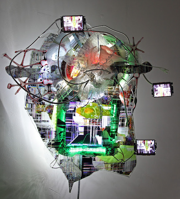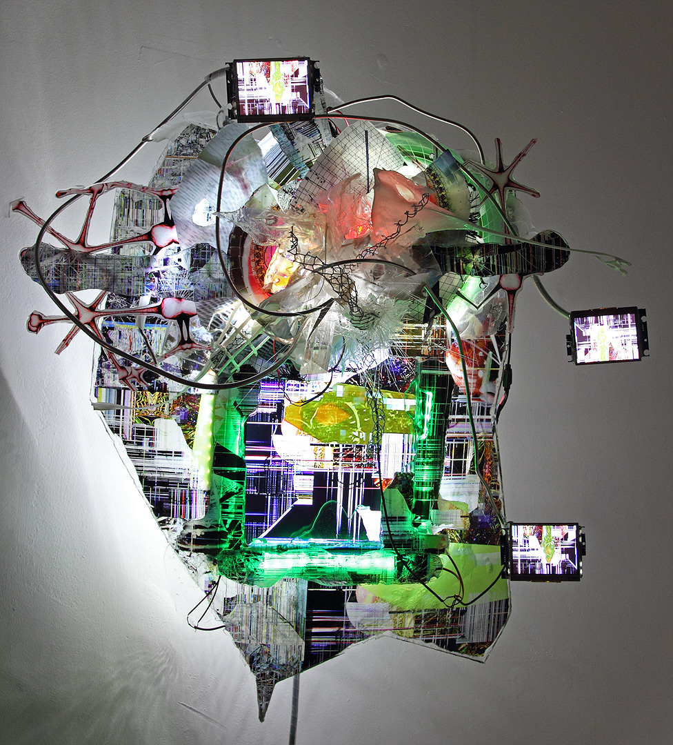 “Screenscaping #3″ 2013 ,4 Channel Video Sculpture, (1) 19″ LED screen, (3) 3.5” LCD screens , fiber optics, printed plastic, glass, metal, Auto-start HD Media Player, 1 of 1 video/audio track